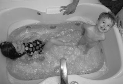 We have 3 1/2 bathrooms in our house. We actively use 2 1/2 of those. There's not really any reason for this, other than the last one is just kind of a guest bathroom....with a jacuzzi tub. It's kind of an odd set up with the tub being encased in almost its own room, where you (being me) would have to climb up the steps of it and walk along the outside of it. But Sage came home from school on Monday asking if she and Jaggar could take a bath in it that night to play. I think she may have done this like one other time, and it was way before Jaggar was born, so I didn't see any problem with it. They had a blast. You couldn't hear yourself think with the echoes of screams in there. It was terrifying because if Jaggar just moved the wrong way, his face would be under the water, but he wasn't the least bit afraid...except when we tried to turn the jets on. He hated that. They had a blast "swimming." :)