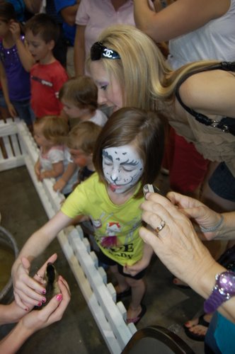 Then this cutie saw people walking around with their faces painted, and that's what she wanted. When she was 3, we wanted her to to do it, but she wouldn't. So we found the table. There were so many cute, girlie designs: butterflies, princess type masks, fairies...and she picked....
